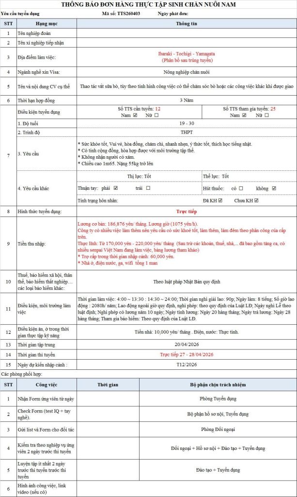 Xuất Khẩu Lao Động Nhật Bản – Tuyển 12 Nam Chăn Nuôi, Vắt Sữa Bò Ibaraki, Tochigi, Yamagata Về Tay 17 – 22 Man. Lương Cao – Bay Nhanh – Phí Đi Chưa Đến 100Tr. Phỏng Vấn Ngày 28/04/2026
