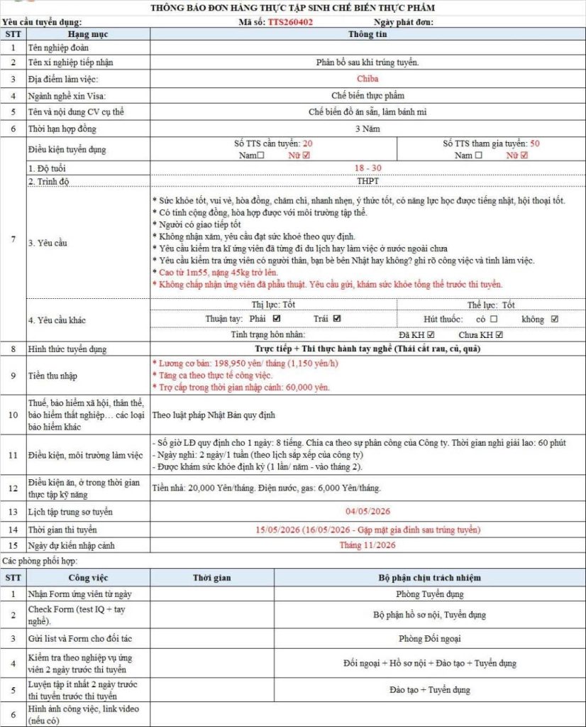 Tuyển 20 Nữ Chế Biến Thực Phẩm, Bánh Mỳ Tại Chiba Tập Đoàn Siêu Thị Life Lương Về Tay 17 – 23 Man. Phỏng Vấn Ngày 15/05